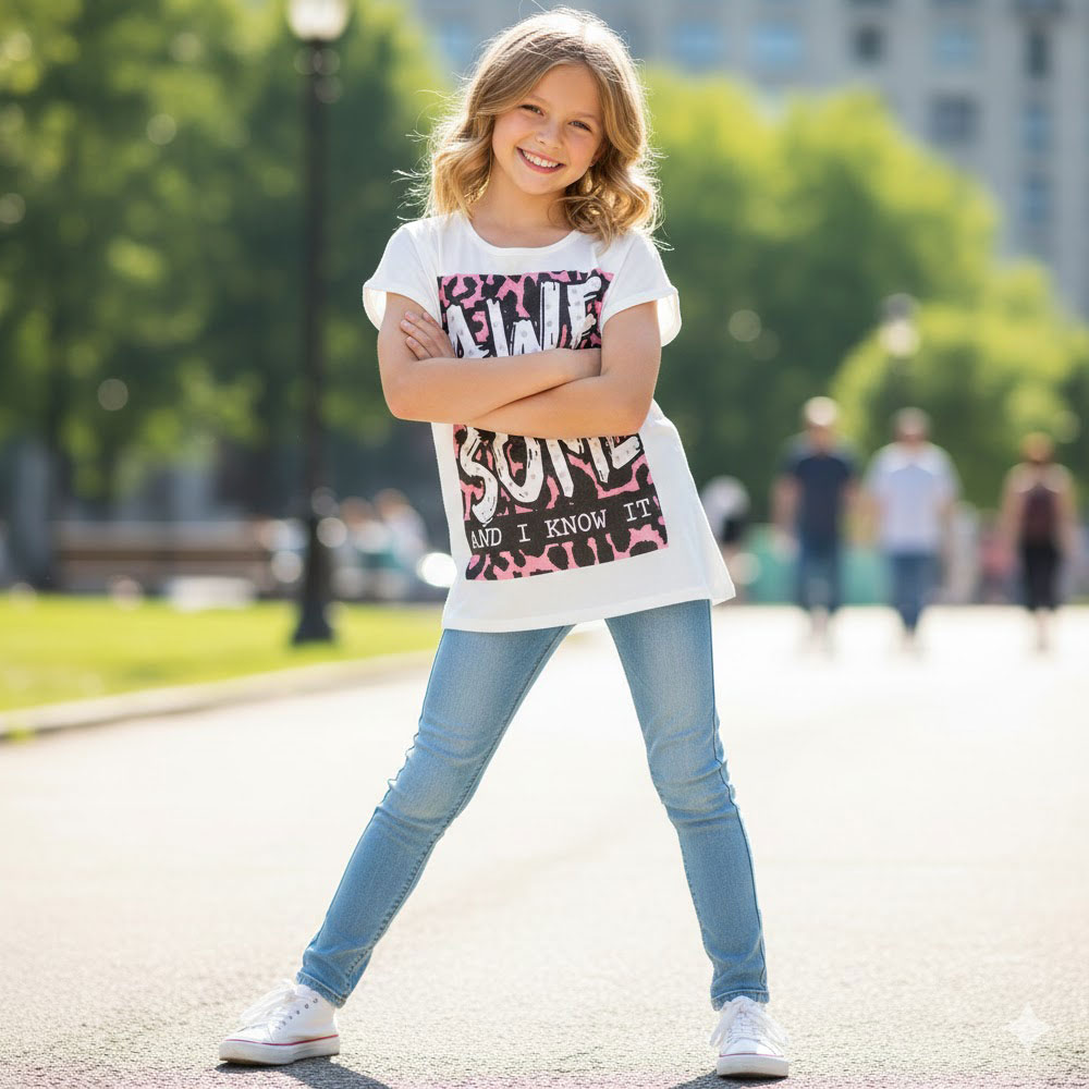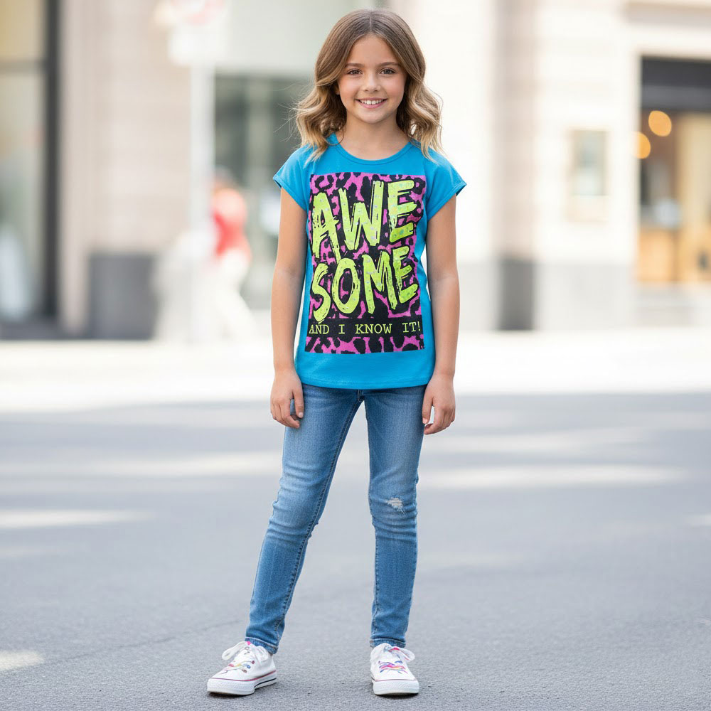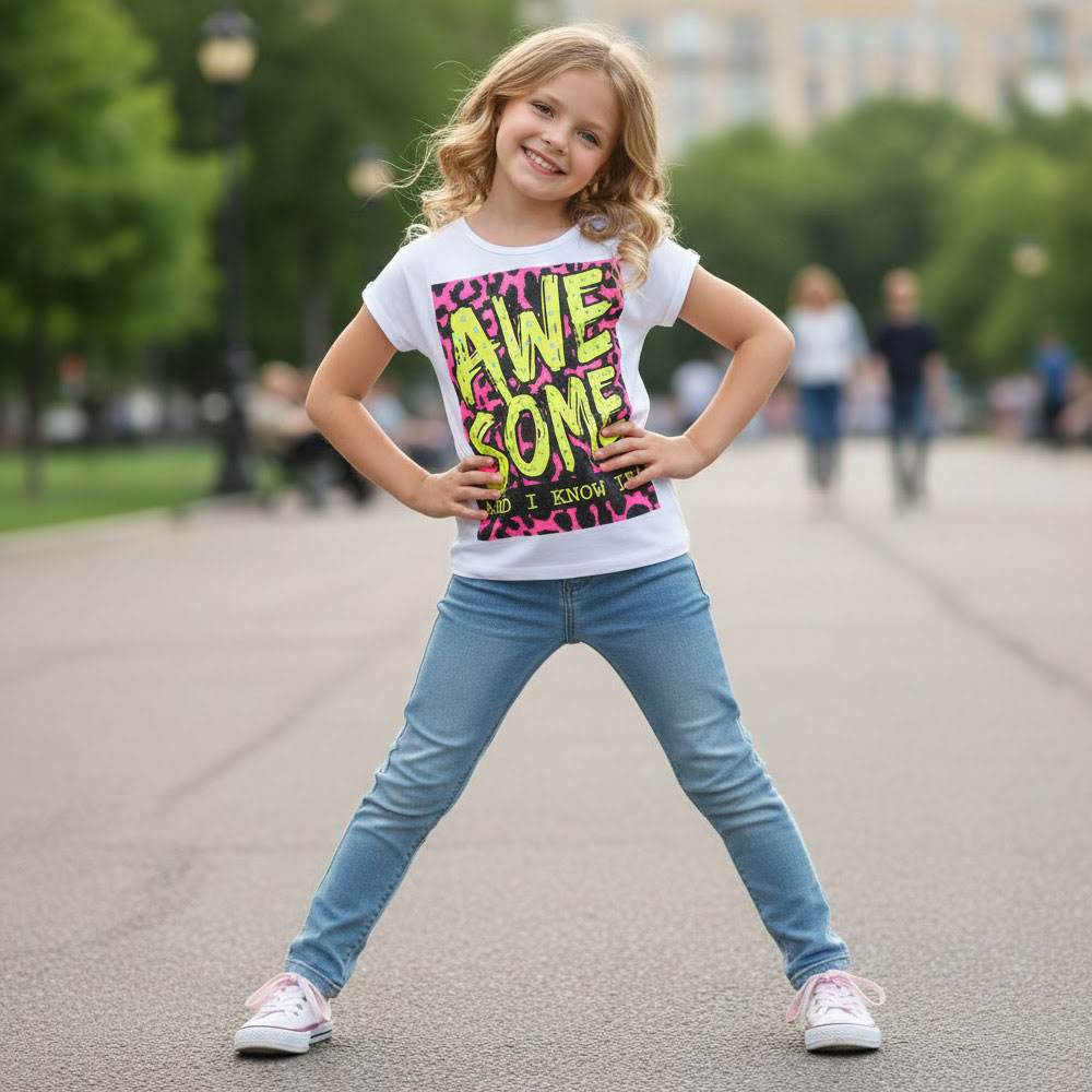 Bright, bold, and full of attitude! This girl’s graphic tee features a vibrant “AWESOME AND I KNOW IT!” print with neon accents and a fun leopard style background. Made from soft, stretchable fabric, it keeps kids comfy all day long. Perfect for school, casual outings, or everyday wear, this stylish top pairs easily with jeans, shorts, or leggings for a cool, confident look.