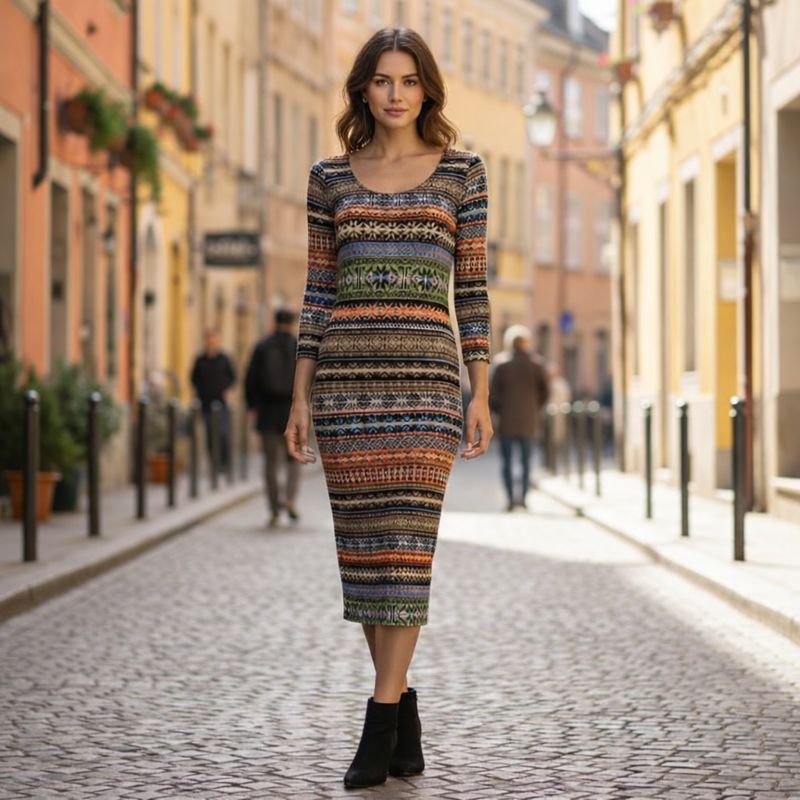 Elevate your everyday style with this beautifully crafted three-quarter sleeve midi dress, designed to offer both comfort and sophistication. Featuring a flattering slim-fit silhouette and an eye-catching multicolor patterned knit, this dress effortlessly transitions from daytime outings to evening occasions. The soft, stretchable fabric hugs the body in all the right places while allowing ease of movement, making it perfect for all-day wear.