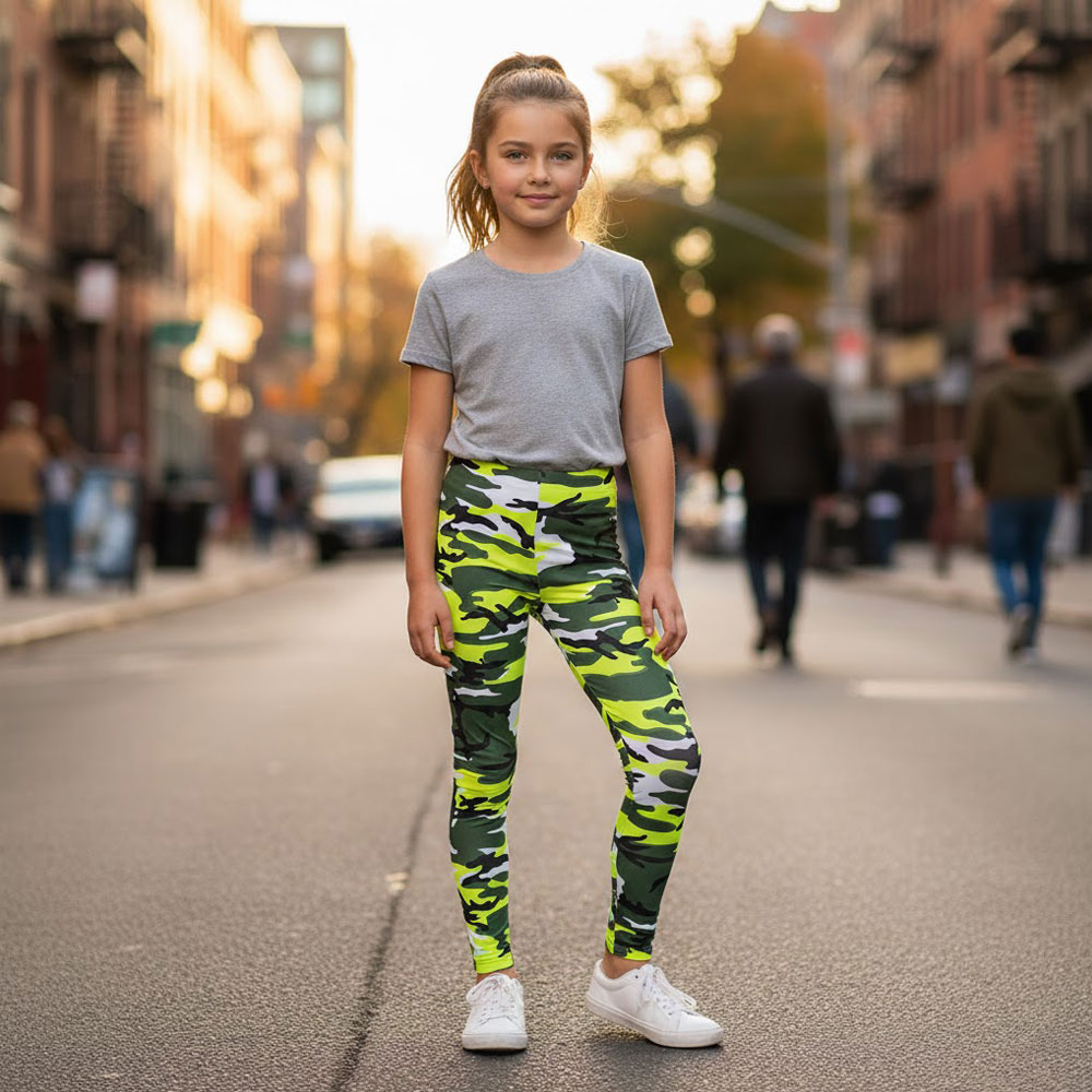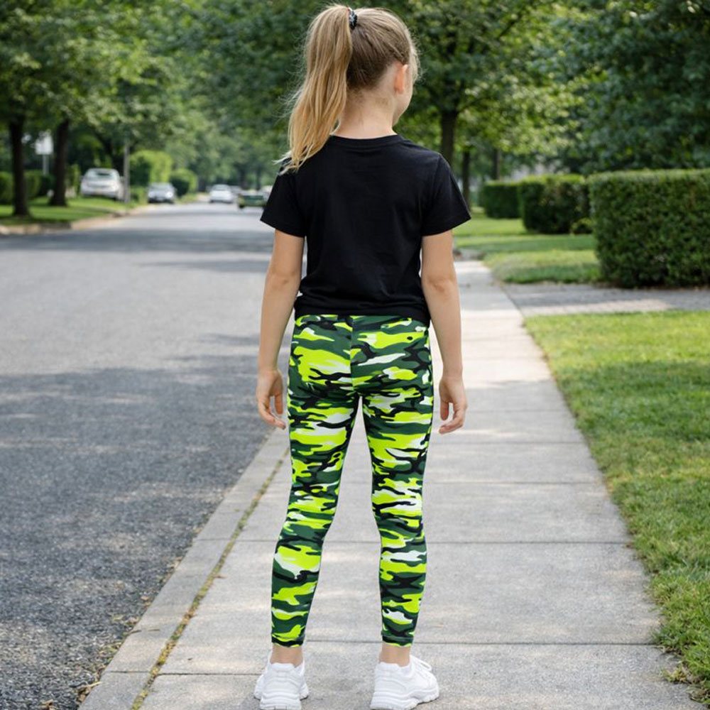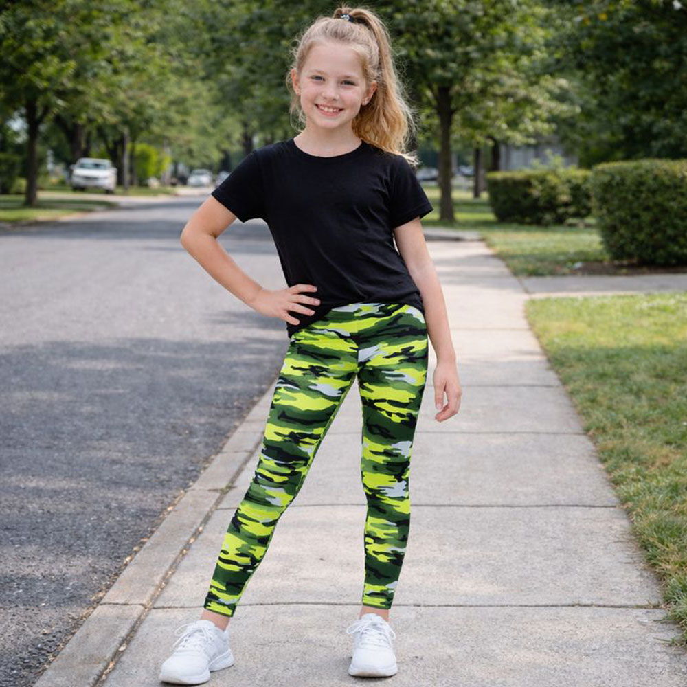 Add bold style and all-day comfort to your child’s wardrobe with these eye-catching neon color camouflage leggings. Designed for active girls, these leggings combine a trendy camo print with a soft, stretchy fit that’s perfect for everyday wear.