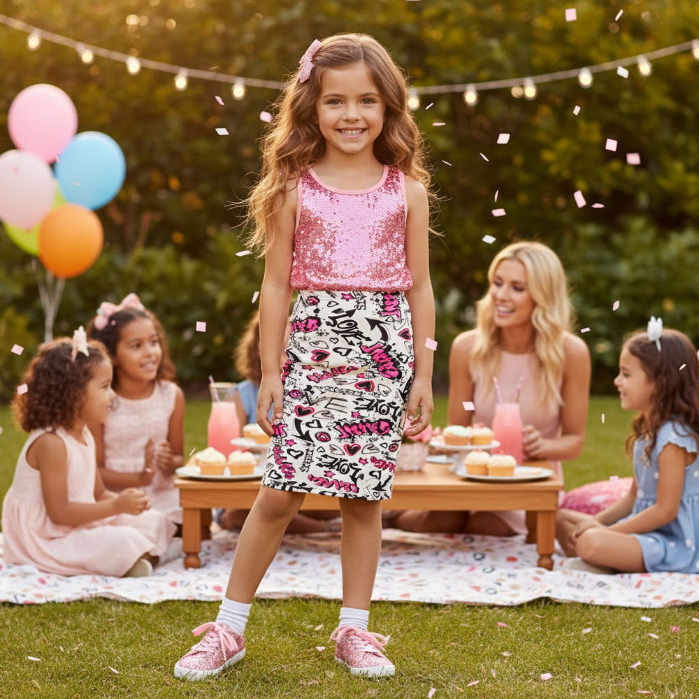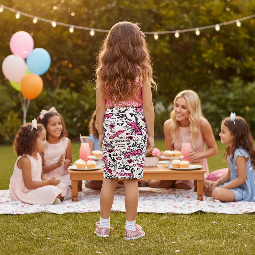 Add a fun and fashionable touch to her wardrobe with this stylish girls’ midi skirt featuring an all-over love and heart graffiti print. Designed to stand out, this skirt blends playful charm with modern street style, making it perfect for parties, casual outings, birthdays, and everyday wear.