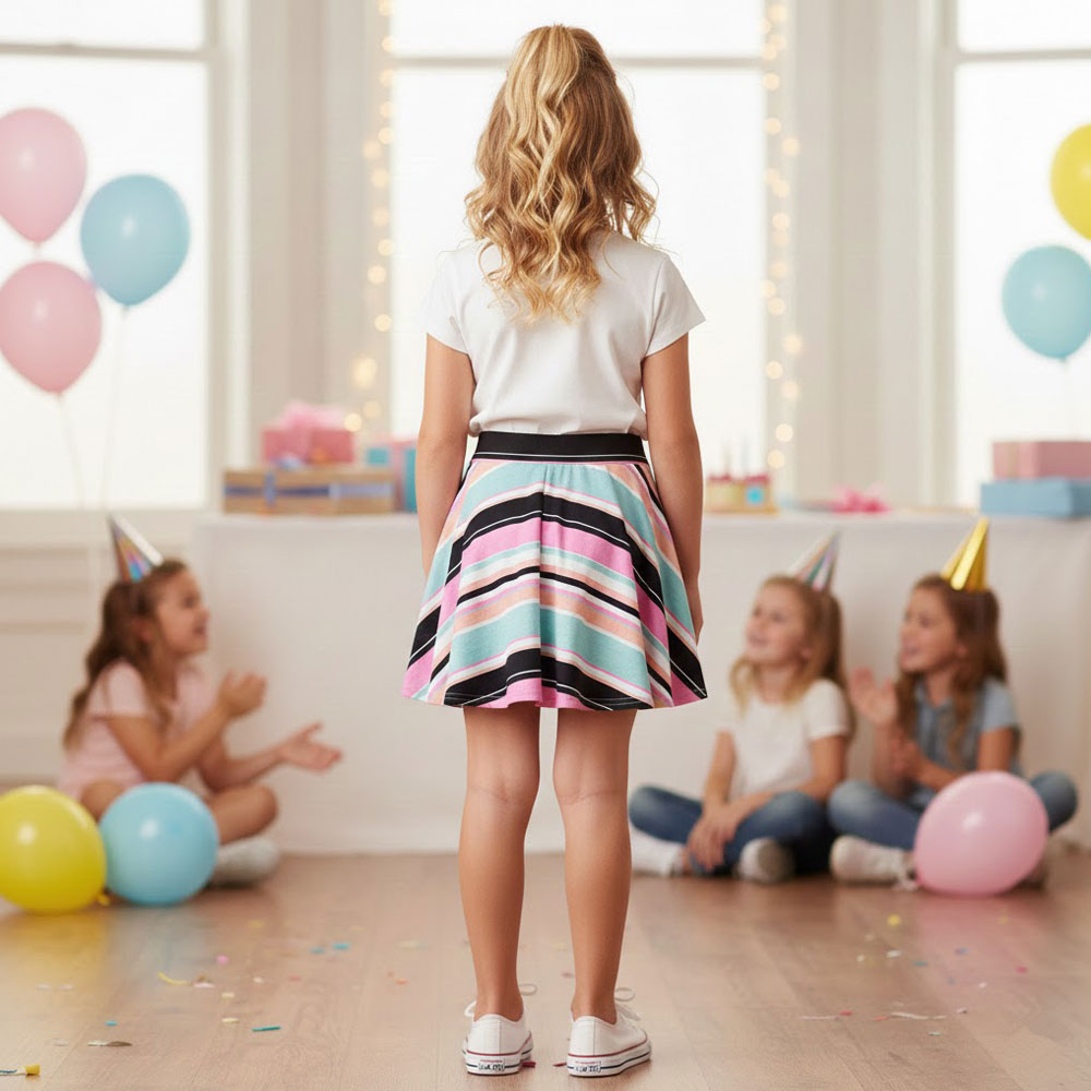 Add a playful pop of color to her wardrobe with this stylish girls’ striped skater skirt. Designed with a flattering flared silhouette and vibrant multi-color stripes, this skirt offers both comfort and charm. The soft, lightweight fabric allows easy movement, making it perfect for active days, parties, and casual outings. Finished with an elastic waistband for a secure yet comfortable fit, this skirt pairs effortlessly with t-shirts, tops, or sweaters.